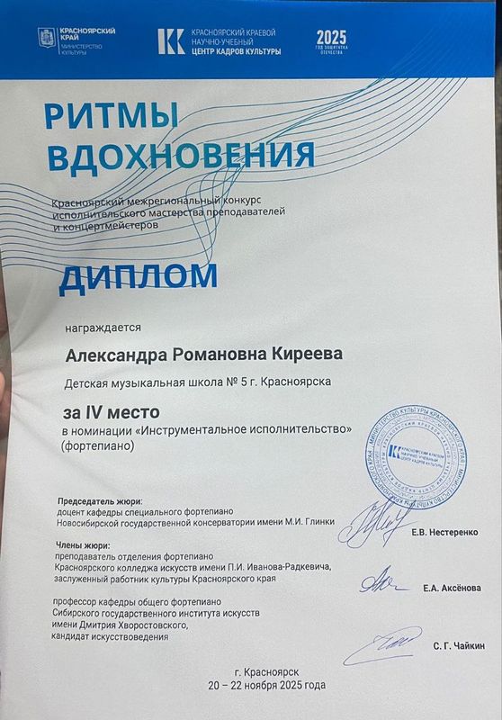 Поздравляем преподавателя фортепианного отделения КИРЕЕВУ АЛЕКСАНДРУ РОМАНОВНУ с успешным выступлением на Красноярском межрегиональном конкурсе исполнительского мастерства преподавателей и концертмейстеров «Ритмы вдохновения»!