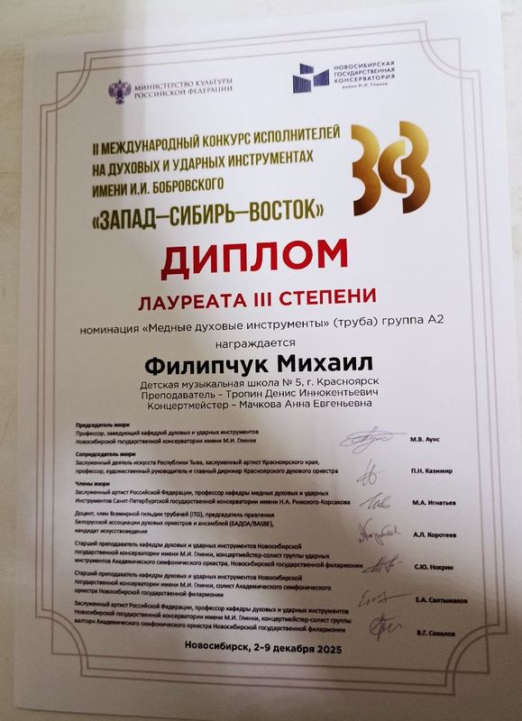 В конкурсе принял участие учащийся Детской музыкальной школы № 5 города Красноярска: Михаил Филипчук, класс преподавателя: Дениса Иннокентьевича Тропина. Концертмейстер: Анна Евгеньевна Мачкова.