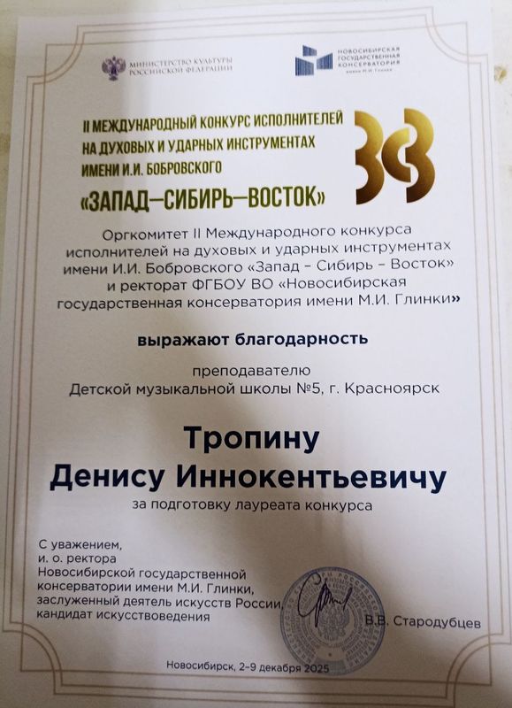 В период со 2 по 8 декабря 2025 года в Новосибирске на базе Новосибирской государственной консерватории имени М. И. Глинки проходил II Международный конкурс исполнителей на духовых и ударных инструментах имени И. И. Бобровского «Запад -Сибирь - Восток».