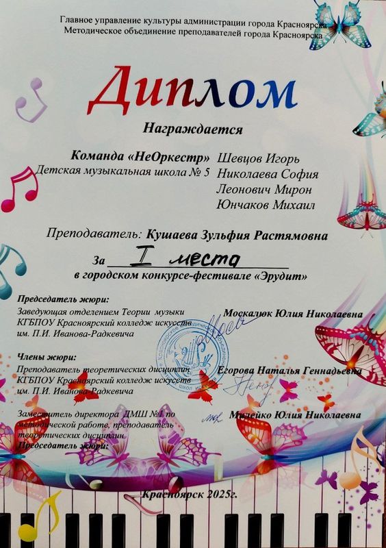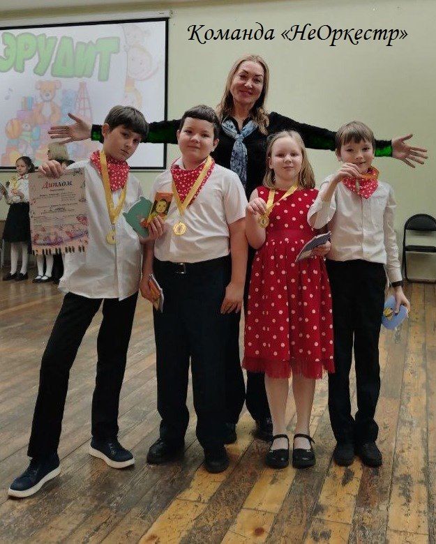 Команда 3 класса «НеОркестр» (преподаватель Кушаева Зульфия Рустамовна) заняла 1 место в игре по слушанию музыки «Эрудиты»! В составе команды гран-призёры прошлого года, ныне учащиеся 3 класса Шевцов Игорь, Николаева София, Леонович Мирон и Юнчаков Михаил.