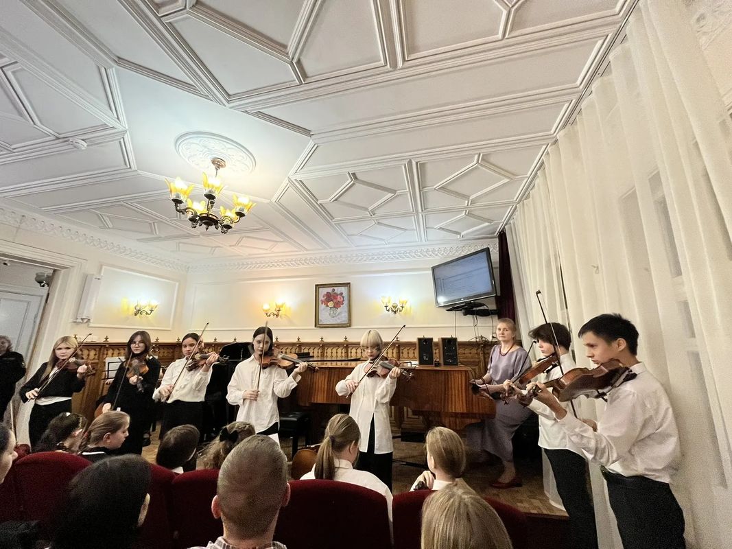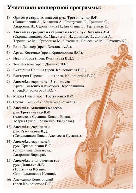 В концерте принимали участие оркестр старших классов, ансамбль средних и старших классов, ансамбли скрипачей. Так же были сольные выступления.