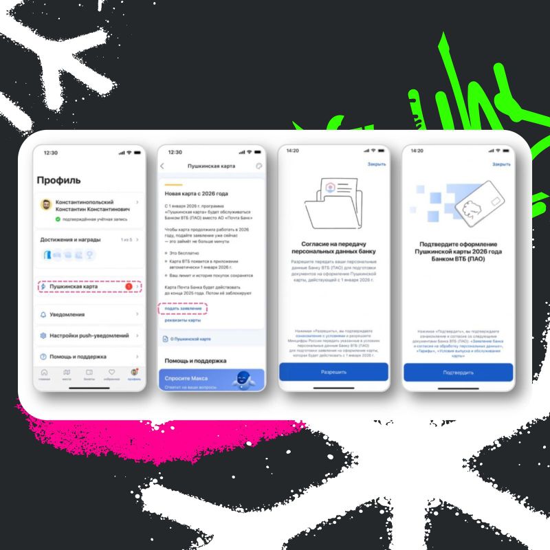 нажмите на всплывающее окно «Подать заявление» или перейдите в «Профиль» → «Пушкинская карта»;
